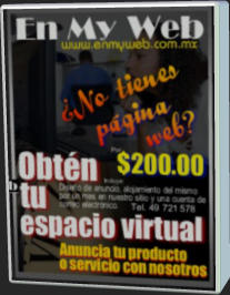 En my web te ofrecemos la posibilidad de anunciar tu producto o servicio en nuestra página, con solo una mínima inversión mensual.Diseñamos y elaboramos su anuncio, damos alojamiento a éste en nuestra página durante todo un mes y le damos una cuenta de correo electrónico personalizada; la cual está acompañada de un panel de control y administración.Todo esto por sólo $200.00 pesos.